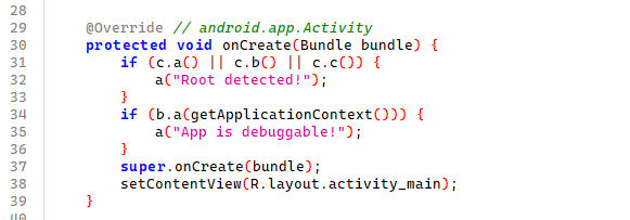 결론적으로 c클래스의 a(), b(), c() 모두 루팅을 탐지하는 메소드이다. 셋 중 하나라도 true를 리턴하면, MainActivity의 a()메소드를 통해 팝업창이 나타난다.