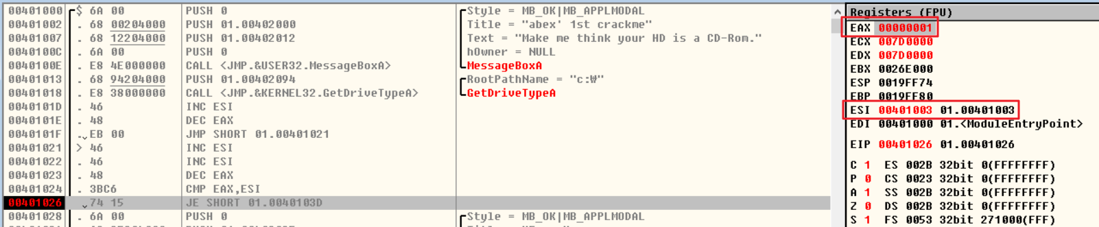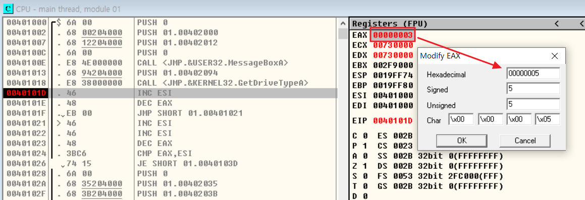 JE 문에 브레이크포인트(F2)를 걸어주고 프로그램을 실행시킨 결과, EAX는 1, ESI는 0041003이 저장된 것을 확인할 수 있다.