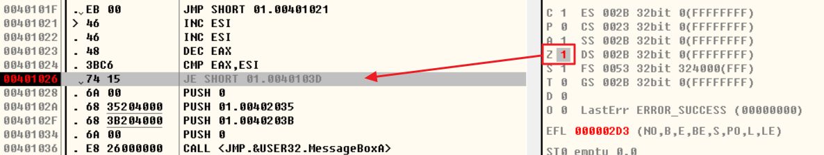 CMP 결과 두 레지스터 값이 같을 경우 ZF(Zero Flag)는 참(1)이 된다. 따라서 다음과 같이 ZF 플래그를 1로 변경한다.