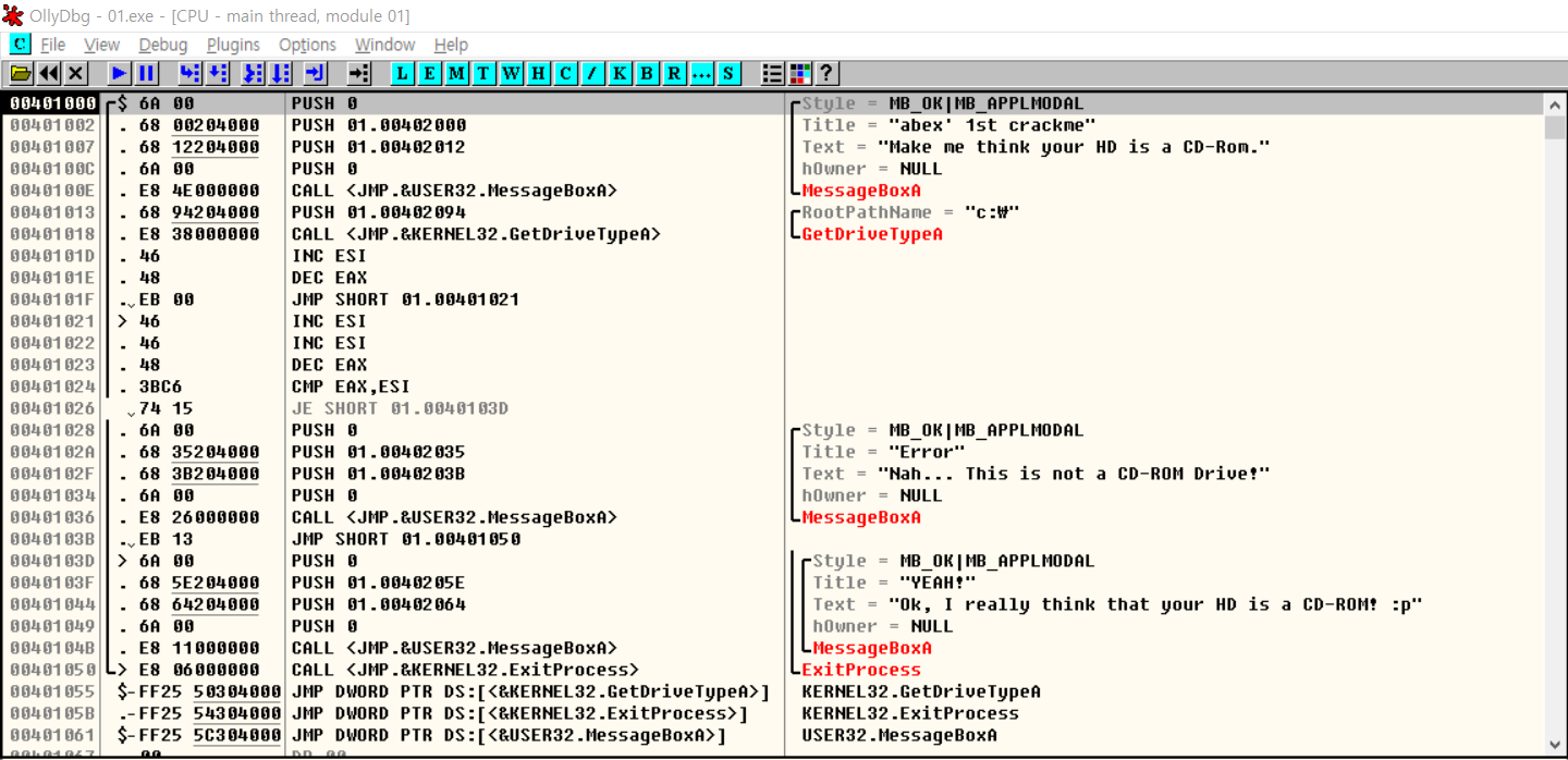 ollydbg로 01.exe 파일을 열어보면 다음과 같은 화면을 확인할 수 있다.
