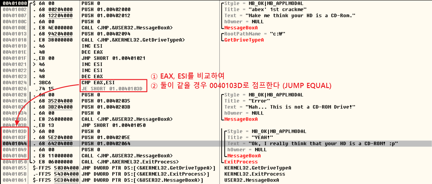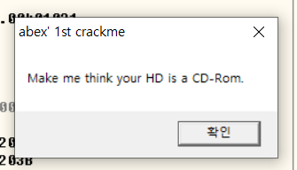 EAX, ESI 두 레지스터의 값을 비교하여 두 값이 동일할 경우 CD-ROM으로 인식했다는 알림창을 띄워준다.