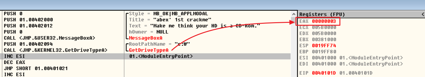 01번 문제는 CD-Rom으로 인식시키기 위핸 GetDriveTypeA의 리턴값을 찾는 문제였으므로, 리턴값 EAX는 5가 되어야 한다.