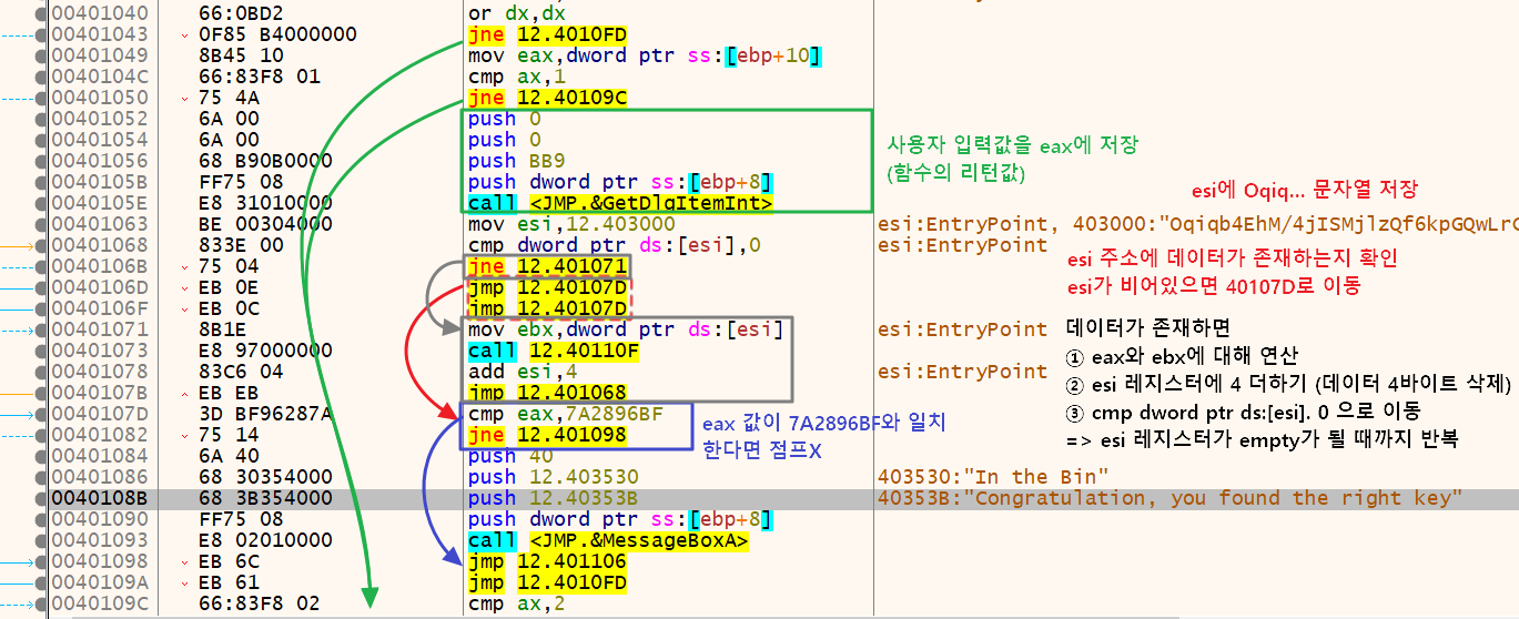 ESI에 데이터가 존재한다면 call 12.40110F 구문으로 EAX EBX에 대한 연산을 진행한다.