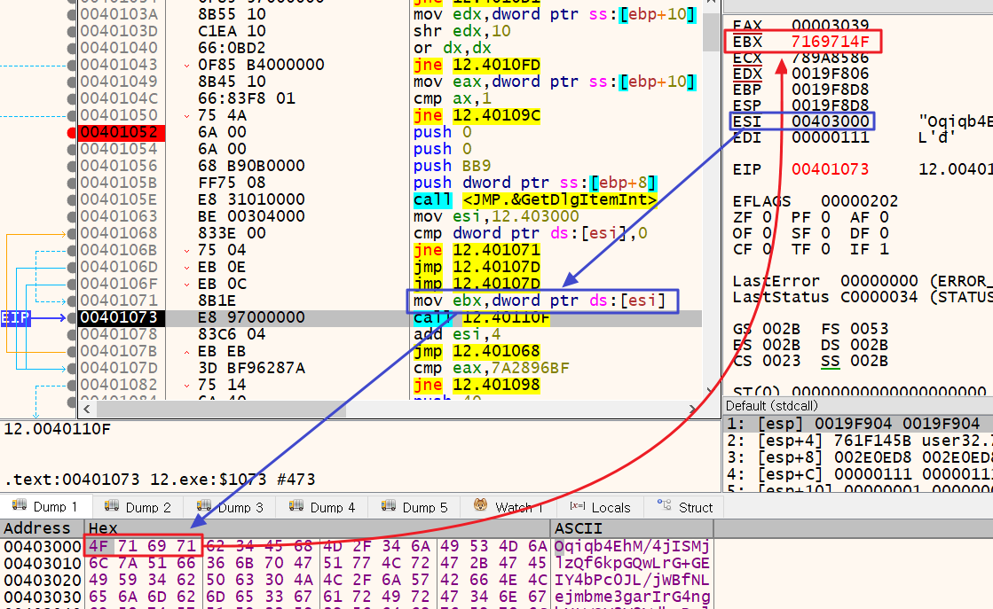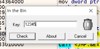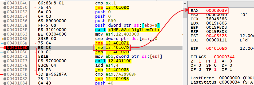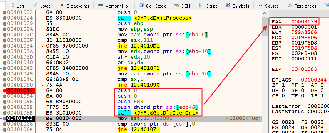 테스트를 위해 key값에 "12345"를 입력했다. GetDlgItemInt 함수 호출이 끝난 후, EAX 레지스터를 확인해보면 "3039"라는 값이 저장되어있다. 10진수 정수 "12345"를 16진수로 변경한 값이 "3039"이다.