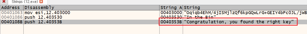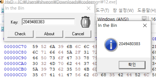Key를 구한 후 입력하게 되면 성공메시지를 볼 수 있다. 이때 성공메시지 대신 Key 값이 MessageBox에 출력 되도록 하려면 파일을 HexEdit로 오픈 한 다음 0x???? ~ 0x???? 영역에 Key 값을 overwrite 하면 된다. 문제 : Key값과 + 주소영역을 찾으시오. Ex) 7777777????????