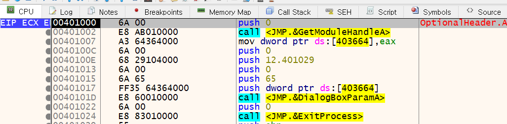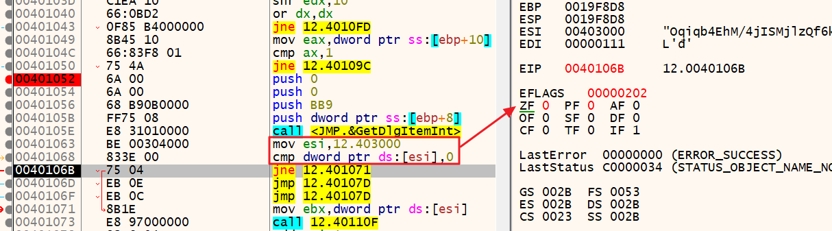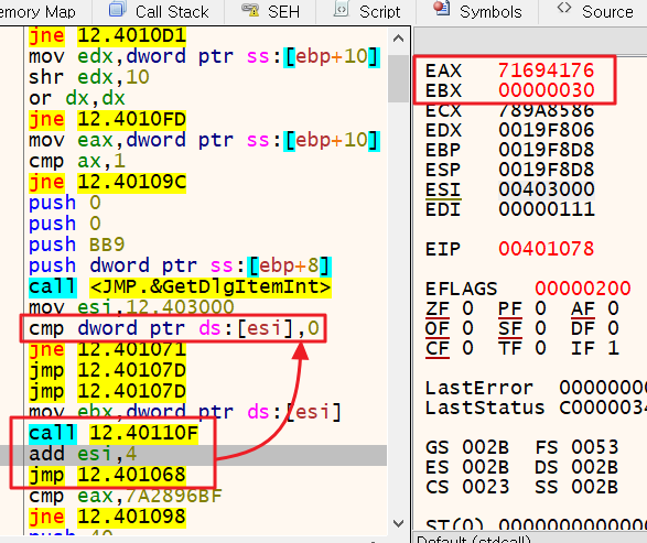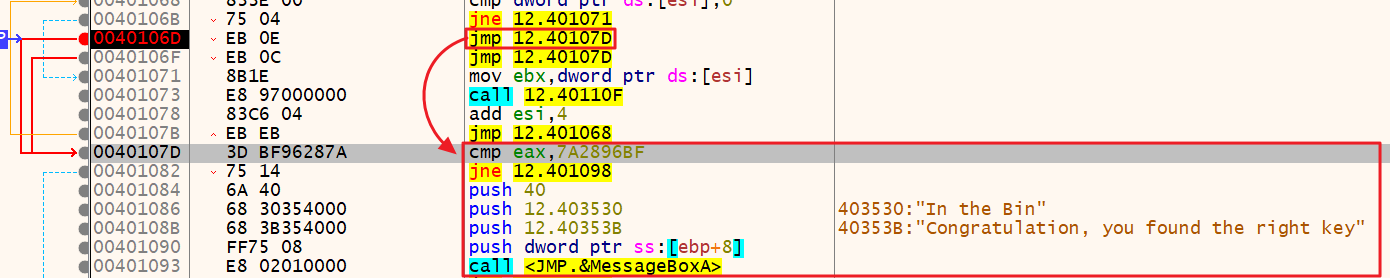 이후 cmp 명령어로 ESI 레지스터에 값이 저장되어있는지 확인한다. 직전에 mov로 값을 저장했기 때문에 Zero Flag(ZF)는 0(False)이 된다. 따라서 jne문에 설정된 주소 401071로 점프한다.
