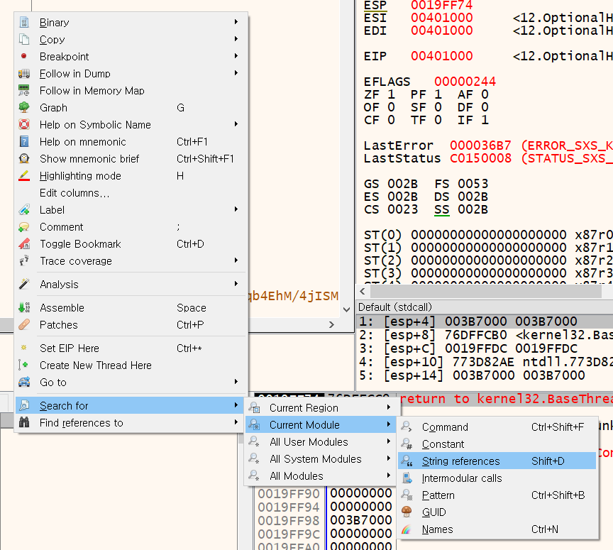 레지스터 연산 후 다시 cmp 구문으로 점프하고, 아직 ESI 레지스터에 문자열이 남아있는지 확인한다.
