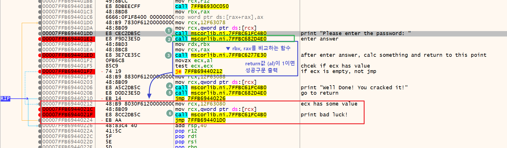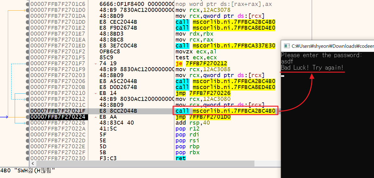 따라서 F8 단축키를 통해 직접 코드를 넘기면서 "Bad Luck! ..." 문자열이 출력되는 부분을 탐색했다. 그 결과, call mscorlib.ni.7FFBCA2BC4B0 구문에서 해당 문자열이 출력됐다.