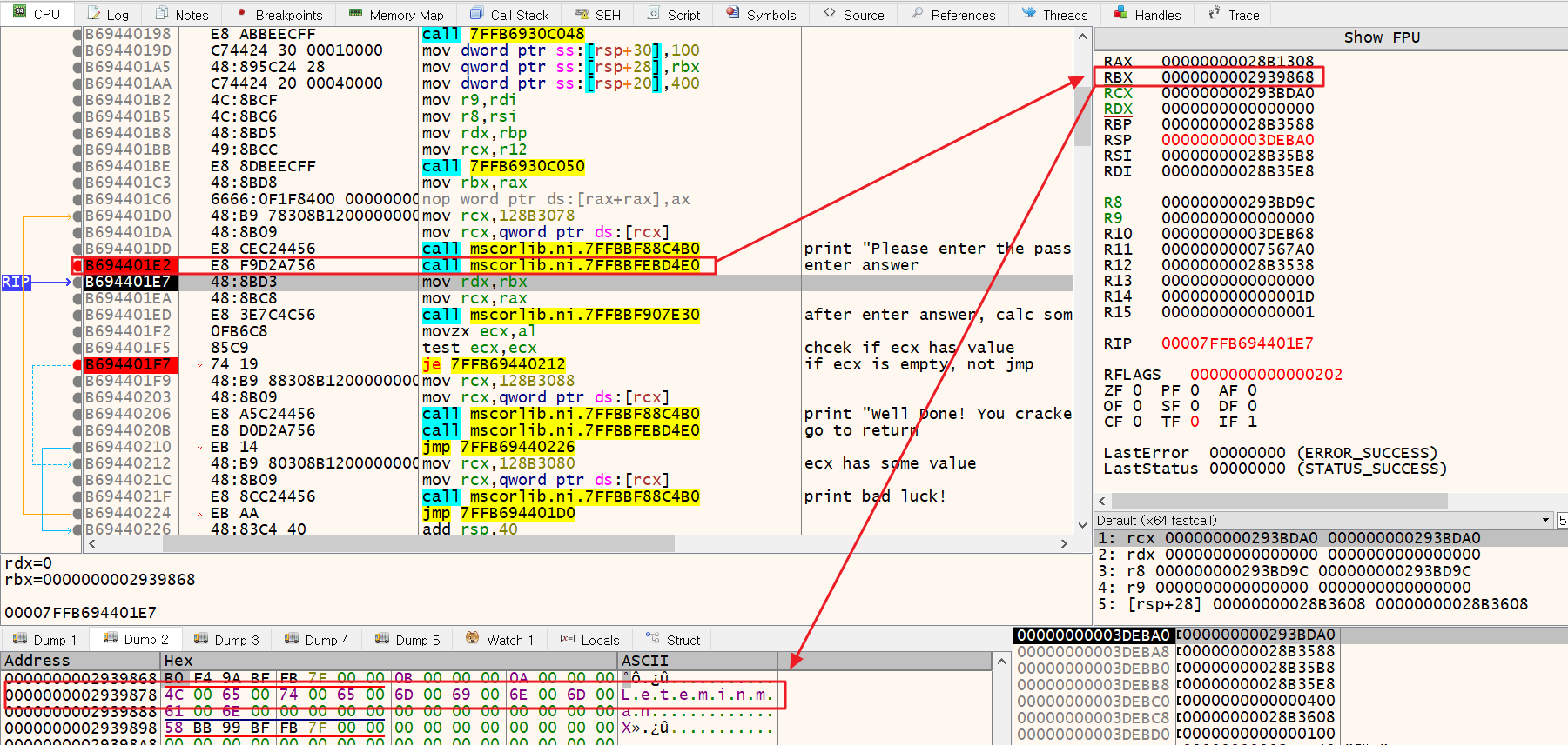 2번 함수 실행 후 RAX, RBX 값을 확인한 결과, HEX 값에 Leteminman이라는 문자열이 저장된 것을 확인할 수 있다.
