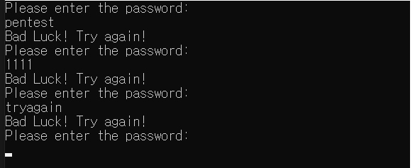 만약 RAX, RBX 두 레지스터 값이 일치하지 않는다면 "Bad Luck! ..." 구문을 출력하고 위 과정을 반복한다.