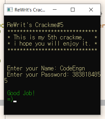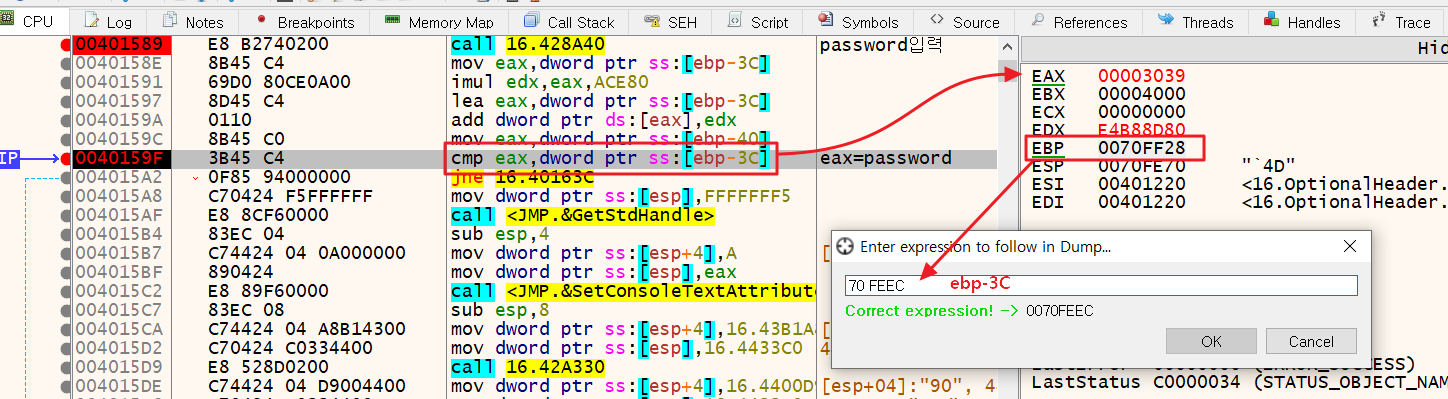 문제 자체는 cmp 구문에 Breakpoint를 걸고 EAX값을 확인한 후, EBP-3C 위치의 hex값을 확인하면 쉽게 정답을 확인할 수 있다.