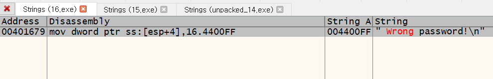 00401679 | C74424 04 FF004400 | mov dword ptr ss:[esp+4],16.4400 | 4400FF:" Wrong password!\n"
