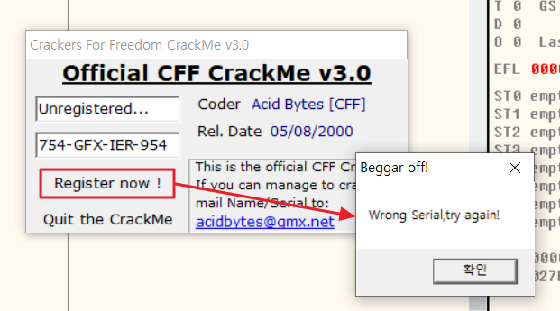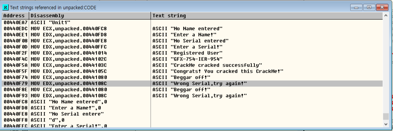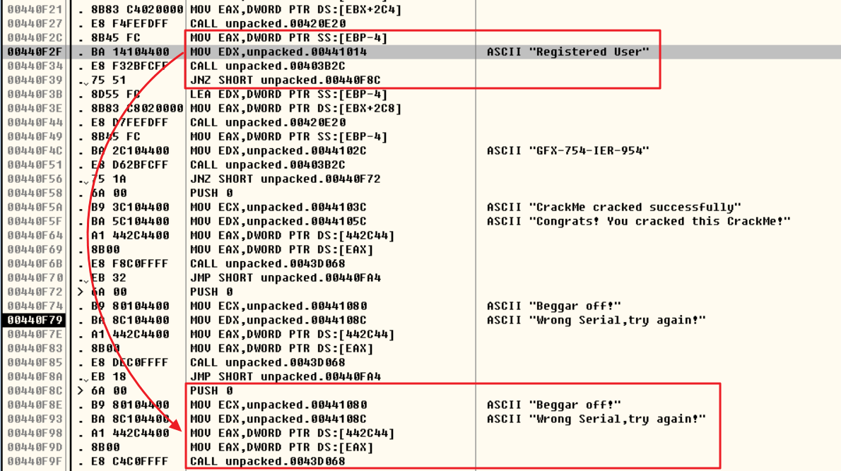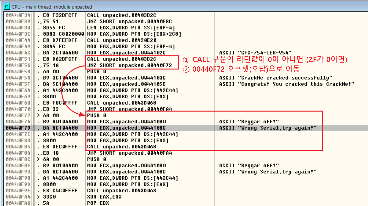 즉, EAX 값이 GFX-754-IER-954인지 확인하는 함수를 기준으로 JNZ 구문을 실행하고 CALL 함수의 결과 리턴값이 0이 아닐 경우 "wrong serial ~" 알림창을 출력하는 00440F72 오프셋으로 이동한다.
