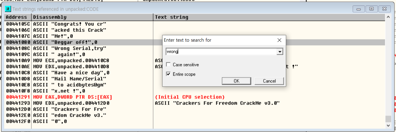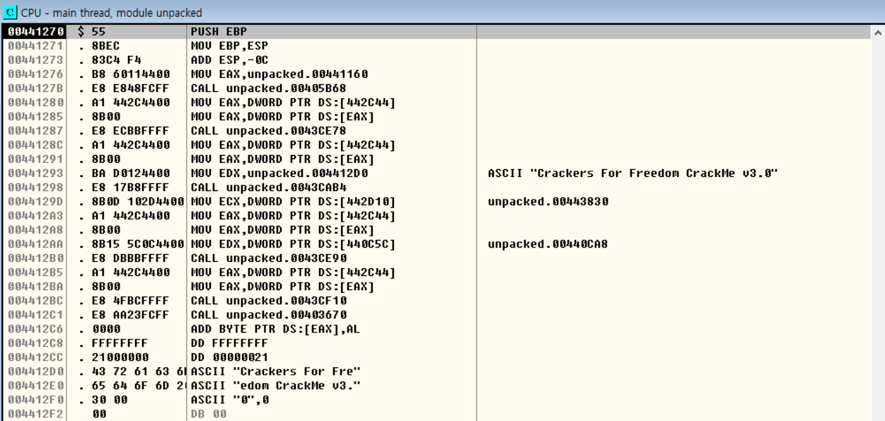 언패킹한 파일을 Ollydbg로 열어보면 코드를 정상적으로 확인할 수 있음을 알 수 있다.