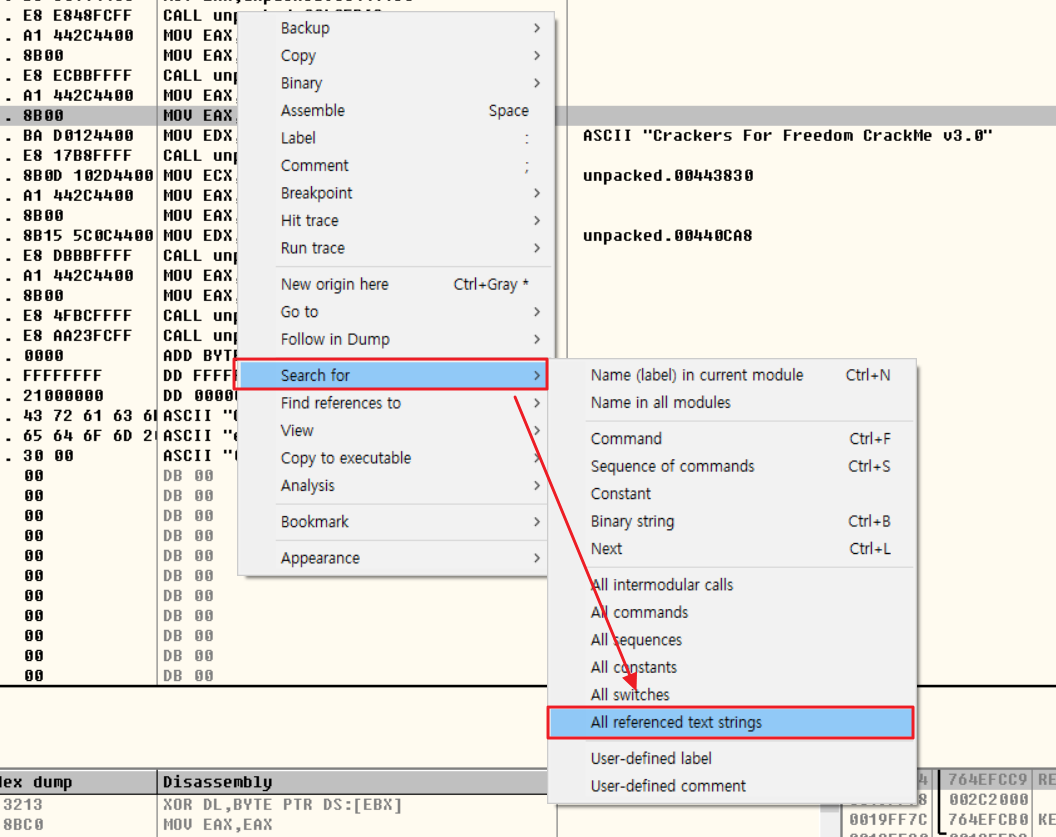 CALL unpacked.00403B2C 구문을 따라 오프셋 00403B2C로 이동하면 함수의 내용을 확인할 수 있다.