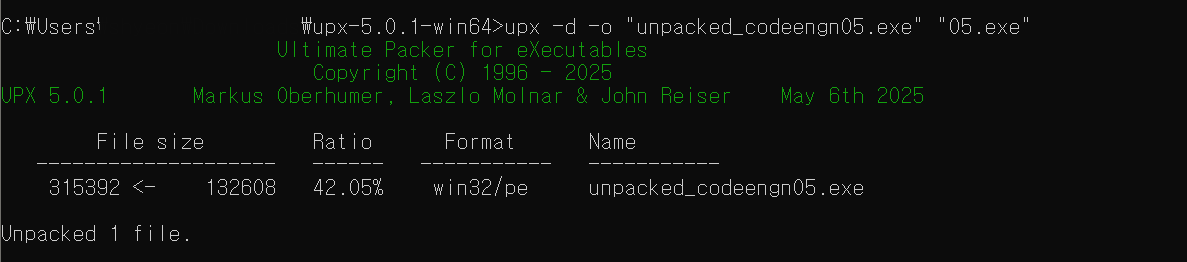 upx -d -o "출력 파일 이름" "언패킹할 파일 이름"