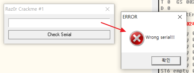 시리얼번호를 입력하지 않거나 잘못된 시리얼 번호를 입력하면 "Wrong serial!!!" 이라는 문자열을 확인할 수 있다.