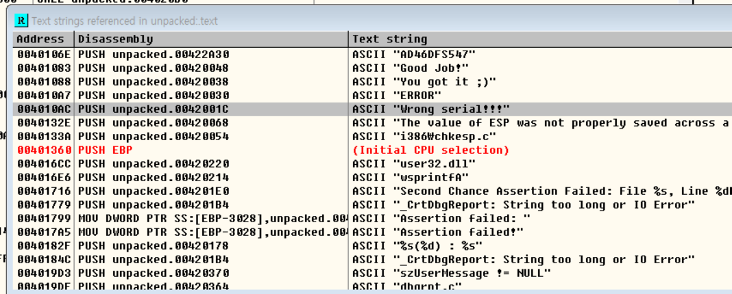 Unpack을 한 후 Serial을 찾으시오. 정답인증은 OEP + Serial Ex) 00400000PASSWORD