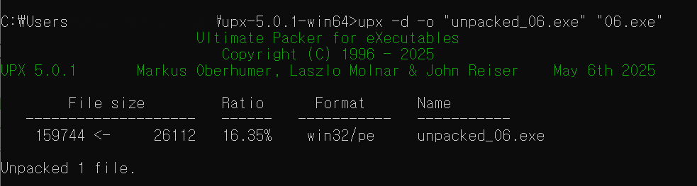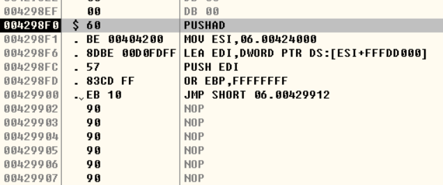 Ollydbg에서 06.exe를 실행하면 다음과 같이 PUSHAD 명령어를 사용한 것을 확인할 수 있다. = UDX를 이용해 패킹을 진행했음을 알 수 있다.