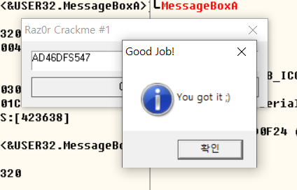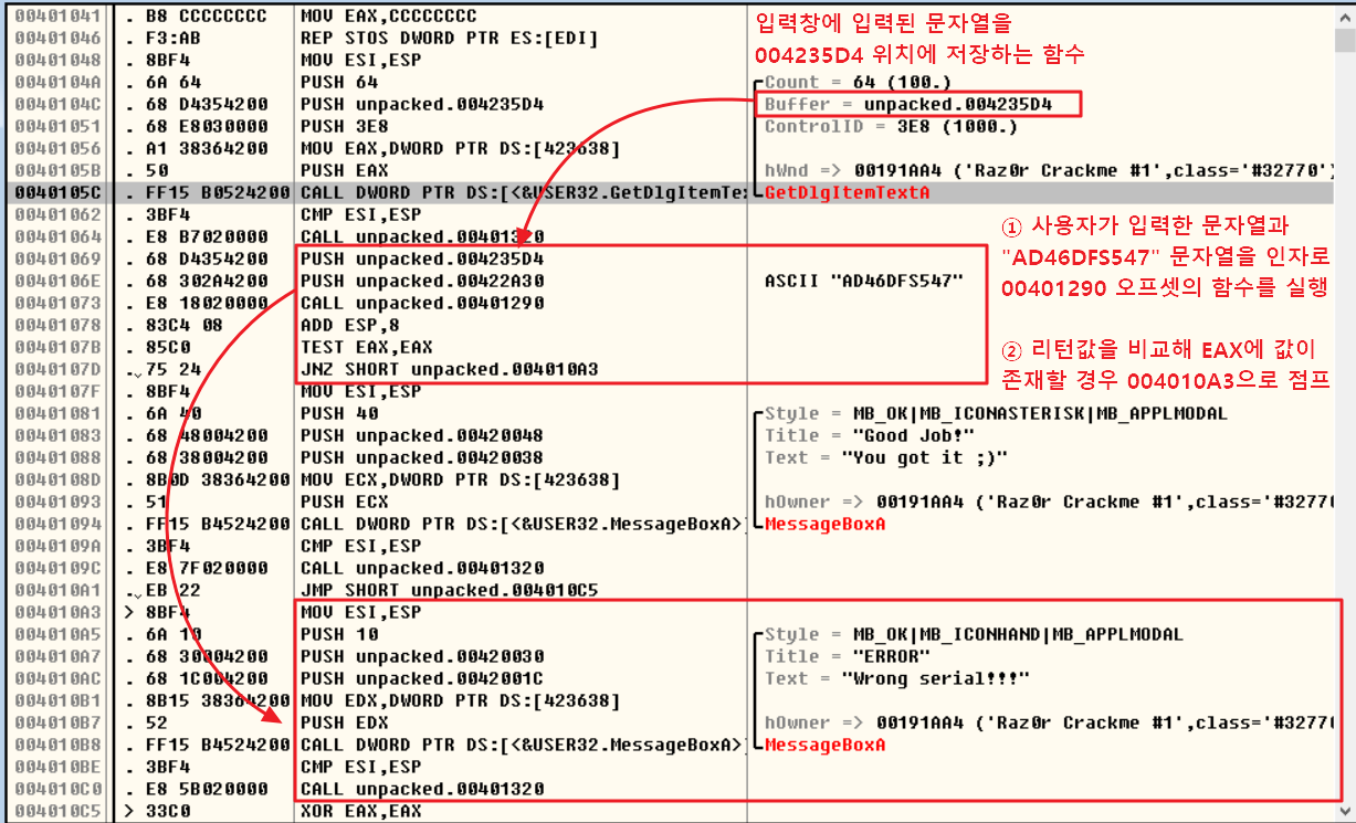 즉, 아스키 문자열 AD46DFS547이 사용자 입력 문자열과 동일한지 확인하고, 동일하지 않을 경우 에러 메세지를 출력하는 오프셋 004010A3 위치로 이동시킨다.