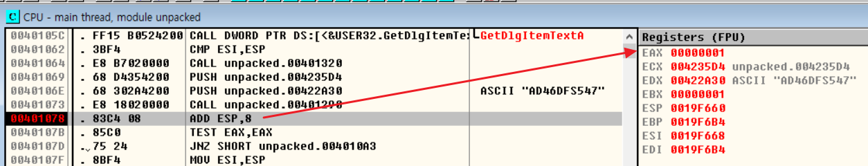 따라서, CALL unpacked.00401290 구문은 사용자가 입력한 시리얼 번호가 AD46DFS547 와 일치할 경우 0을, 일치하지 않을 경우 1을 반환하여 분기 처리를 하고 있음을 알 수 있다.