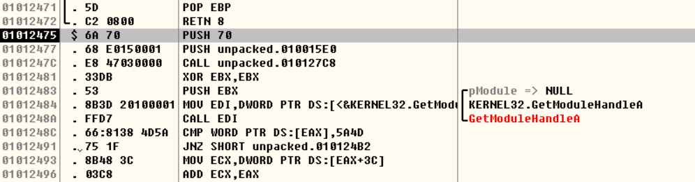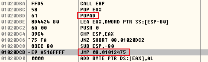 POPAD 명령어 이후 JMP 구문이 향하는 주소는 01012475이다.