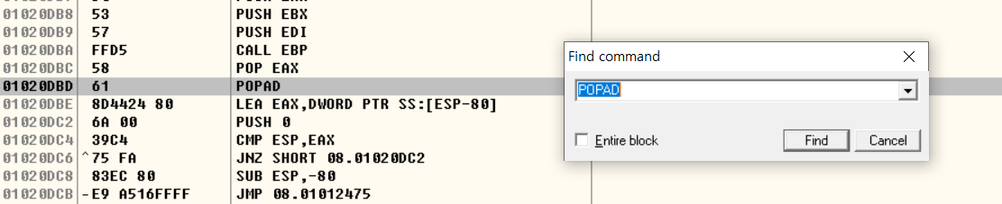 UPX로 패킹한 프로그램은 대부분 POPAD 이후 JMP가 향하는 주소가 OEP라고 한다. 따라서 Ctrl+F 명령어로 POPAD 명령어를 찾는다.
