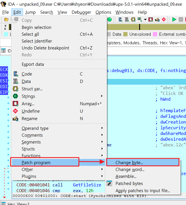 아이다의 경우 00401000 주소를 누르고 Edit > Patch program > Change byte 입력창에 6A 00 68 00 20 40 00 68 12 20 40 00 6A 00 E8 8C 를 입력한다.
