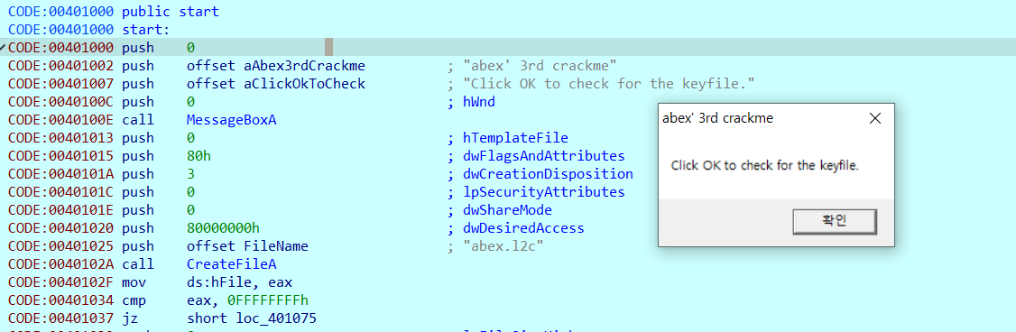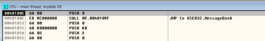 JMP 명령어를 따라 0040100C 오프셋으로 이동해보면 CALL 구문으로 MessageBoxA 함수를 실행하는 것을 확인할 수 있다.