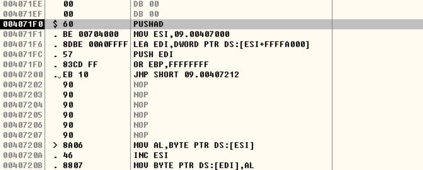 Ollydbg로 09.exe를 열었을 때 PUSHAD 명령어를 확인할 수 있다.