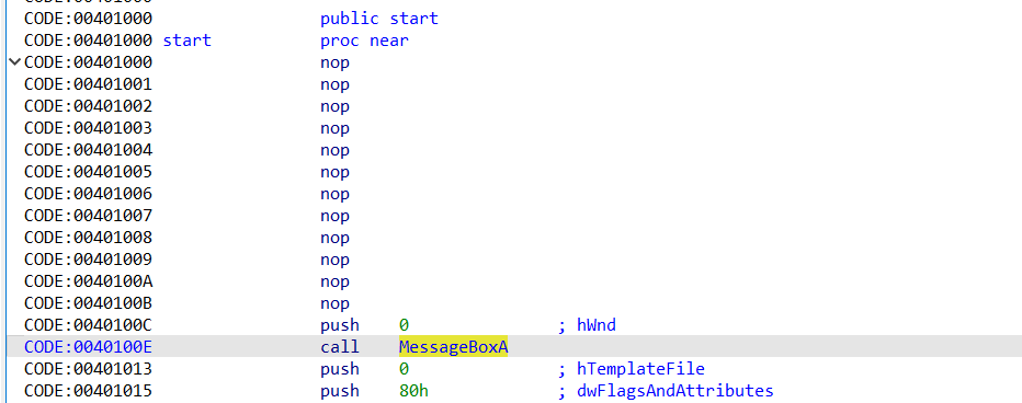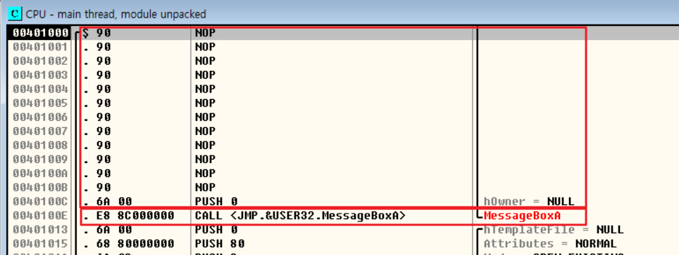 언패킹한 코드의 OEP부분은 다음과 같다. MessageBoxA 함수 윗부분이 NOP로 비어있는 것을 확인할 수 있다.