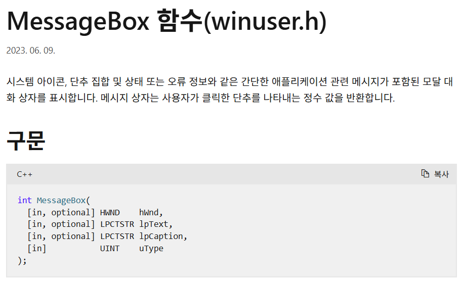 MessageBoxA 함수에 대해 조금 자세히 알아보자. Microsoft 공식문서를 확인해보면 MessageBox는 hWnd, lpText, lpCaption, uTyep 4개의 인자를 갖고있으며, uType 인자는 필수 인자이다. 그러나 코드를 살펴보면 hWnd 인자만을 갖고 있는 것을 확인할 수 있다. 따라서 MessageBoxA의 인자 호출 부분이 Stolen 된 것으로 유추할 수 있다.