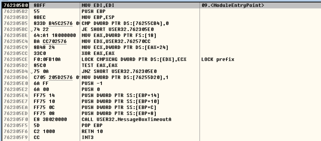 MessageBoxA 함수 내부로 들어가면 MessageBoxTimeoutA 함수 호풀을 위해 다시 PUSH로 인자를 전달하고 있다.