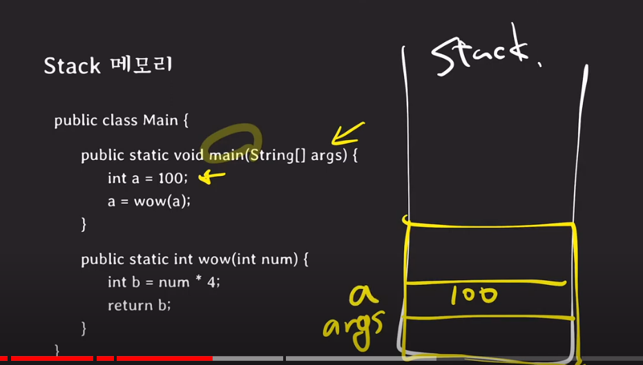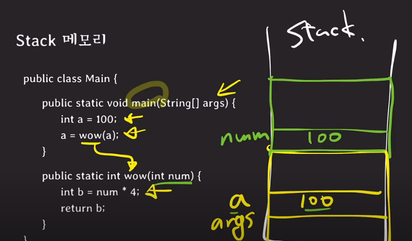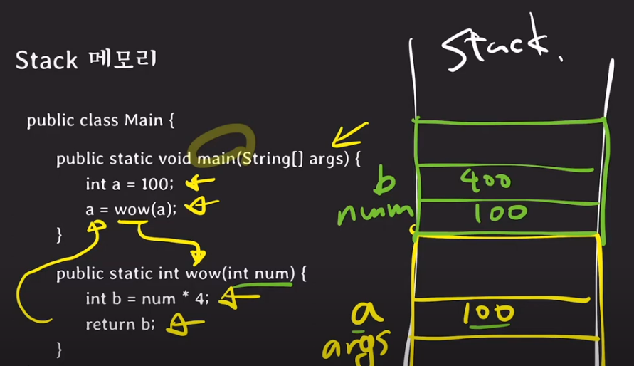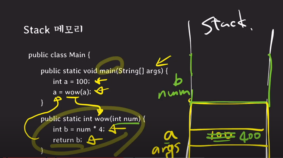 public class Main { public static void main(String[]args) { //매개변수 : args int a = 100; a = wow(a); } public static int wow(int num) { int b = num * 4; return b; } }