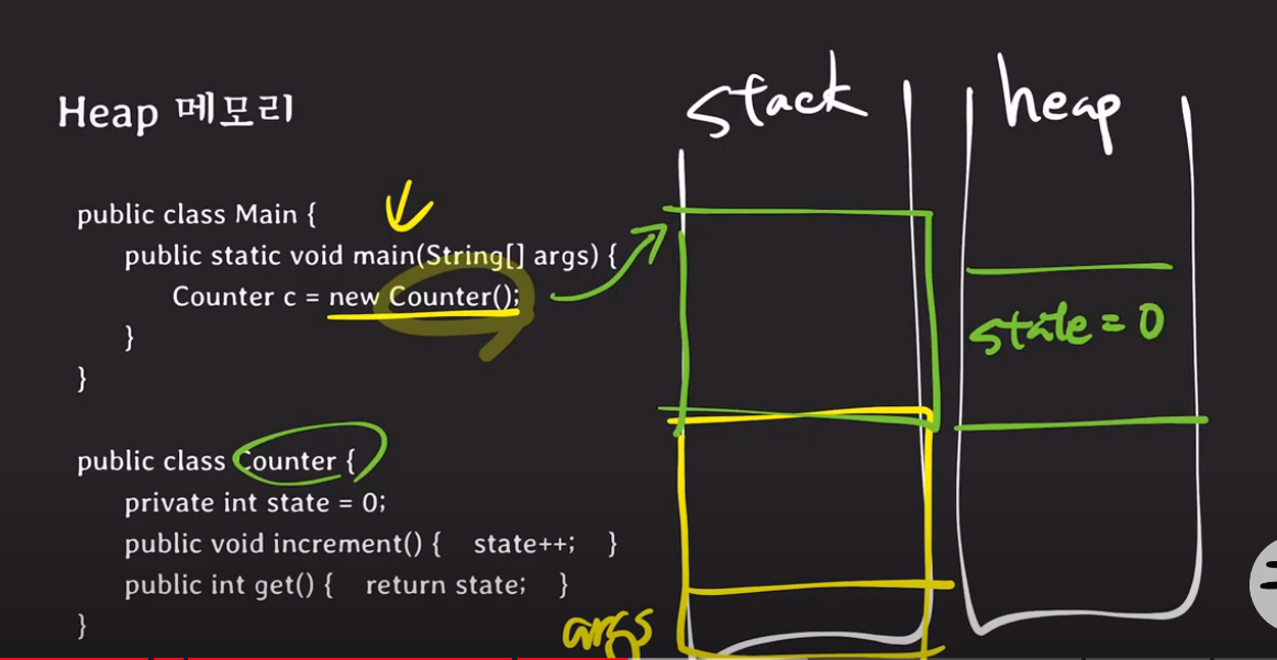public class Main { public static void main(String[]args) { //*매개변수* : args Counter c = new Counter(); //*지역변수* : c } } public class Counter { private int state = 0; //*인스턴스* 변수 public void increment() { state++; } public int get() { return state; } }