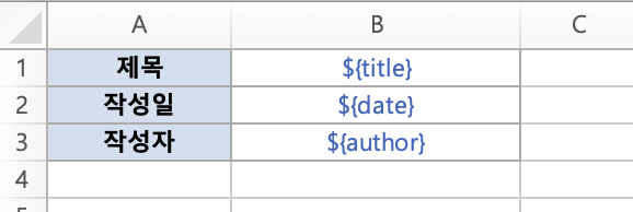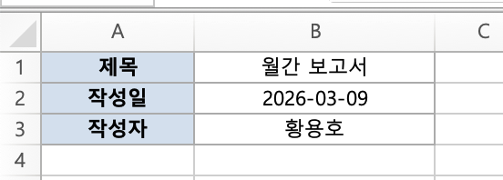 끝입니다. output.xlsx를 열어보면 ${title} 자리에 "월간 보고서"가, ${date} 자리에 오늘 날짜가 들어가 있습니다.