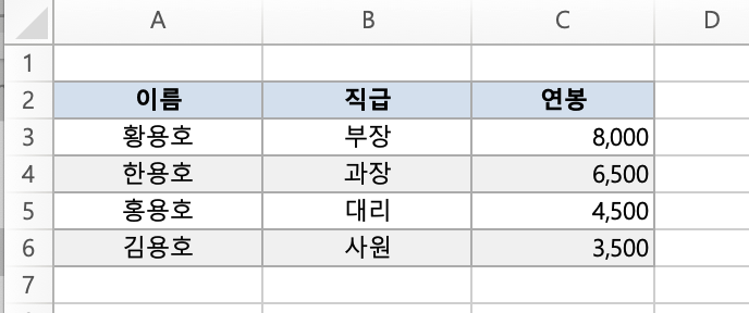 4명의 데이터가 4행으로 펼쳐졌습니다. 수식(=SUM() 등)이 있었다면 범위가 자동으로 조정됩니다.