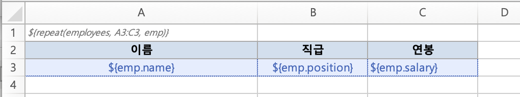 ${repeat(employees, A3:C3, emp)} - "employees 컬렉션의 각 항목을 emp라는 이름으로, A3:C3 범위를 반복해라"data class Employee(val name: String, val position: String, val salary: Int)