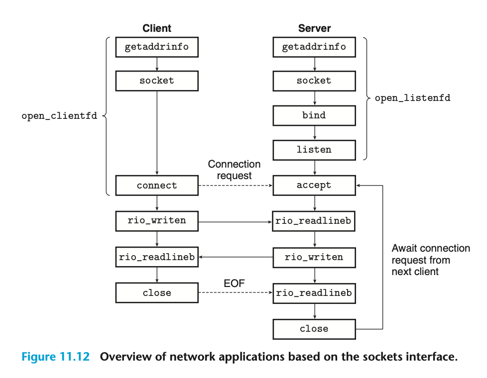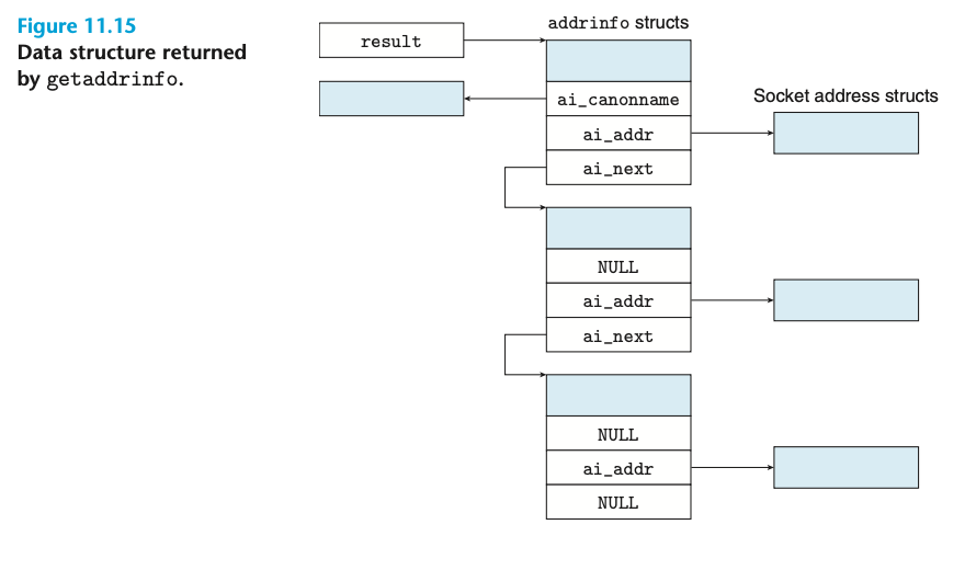 그렇다면 여기서 의문점이 하나 생깁니다. getaddrinfo는 소켓 주소 구조체가 아니라 addrinfo 구조체로 구성된 연결리스트의 더블포인터를 반환해줍니다. 그런데 connect는 소켓 주소 구조체를 바로 인자값으로 받죠. 그렇다면 이 연결 리스트를 순회하며 각 소켓 주소 구조체에 대해 connect를 수행하는 함수가 있다는 사실을 유추할 수 있습니다. 이 함수가 open_clientfd입니다.