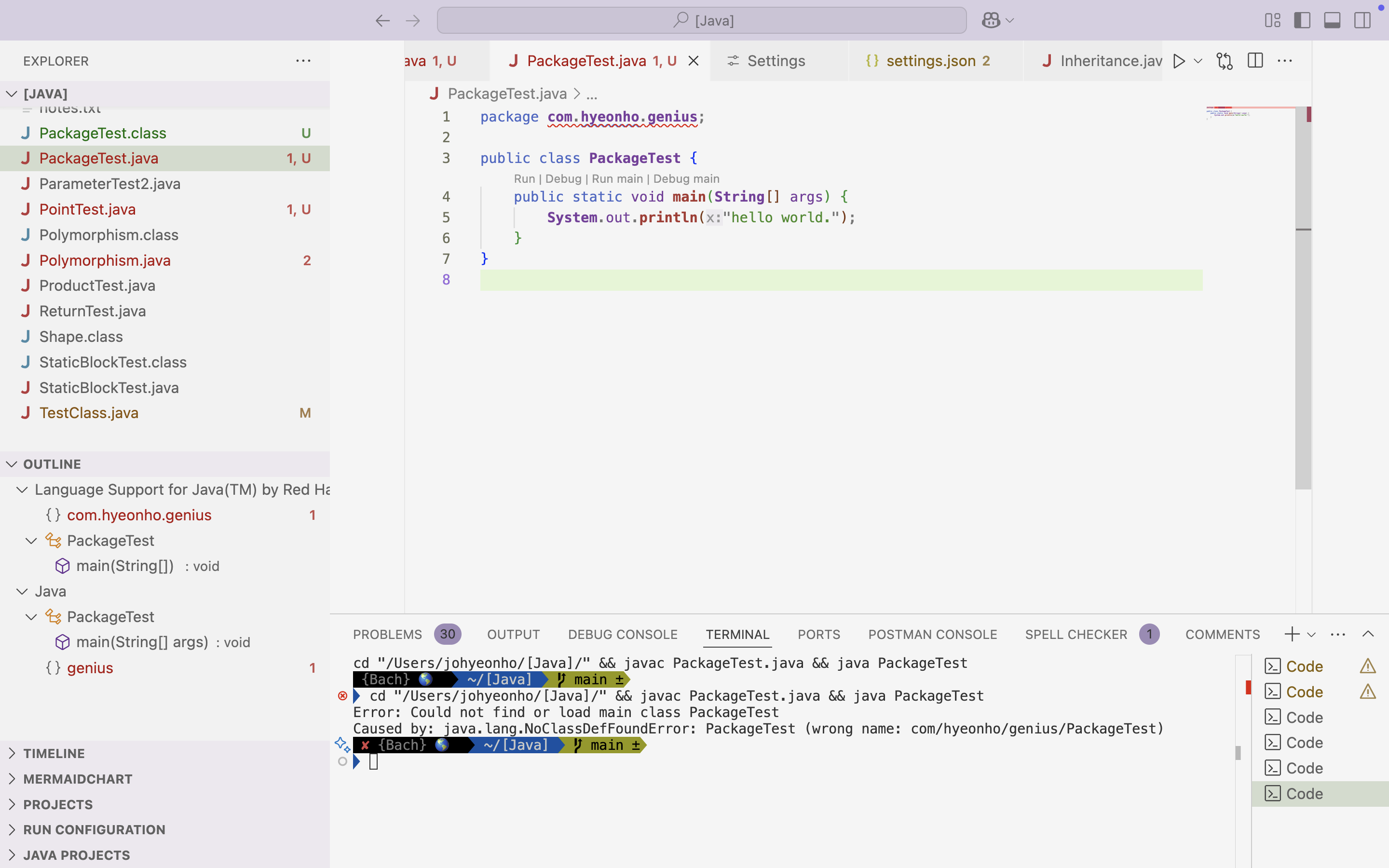 java com.hyeonho.genius.PackageTest로 실행하면 아무 문제 없는데, vs code에서 실행하면 에러가 나고, IDE도 제대로 인식하지 못한다.The declared package "com.hyeonho.genius" does not match the expected package ""Java(536871240)라고 에러가 뜬다.