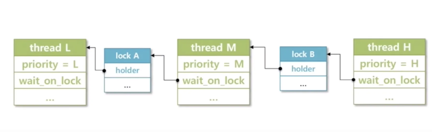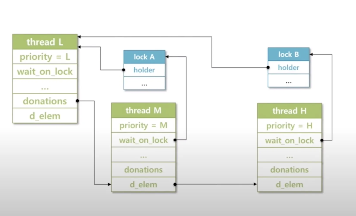 multiple donation: 하나의 쓰레드가 락 여럿을 소유하고 있는 경우, 락 점유 쓰레드는 복수의 락으로부터 우선순위를 상속받아야 한다.