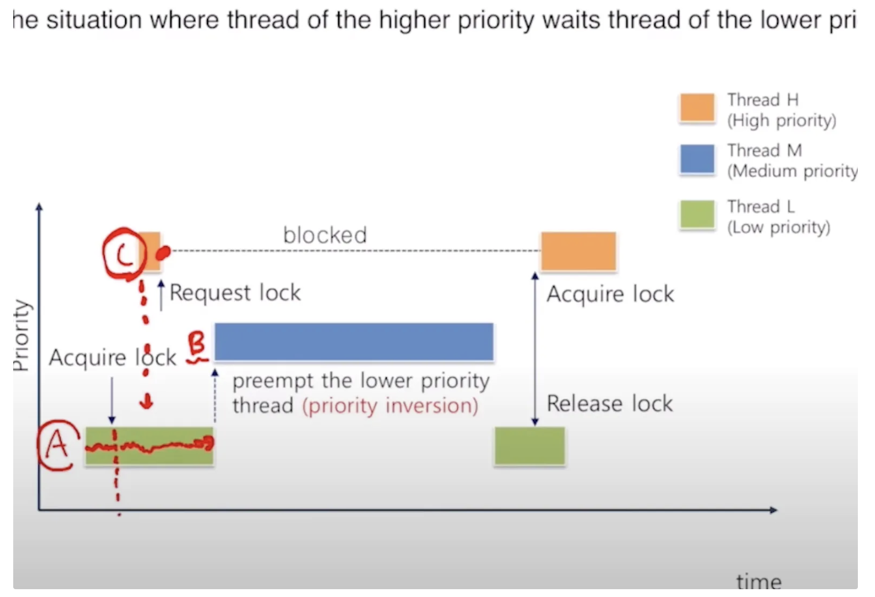 아래는 우선순위 역전 문제를 잘 보여주는 그림이다. 이 경우는 우선순위가 낮은 쓰레드 A가 어떤 락을 획득하고 CPU를 점유한다. 그 후 우선순위가 가장 높은 C가 그 락에 대한 요청을 하고 다시 block 되는데, 이 상황에 A보다는 높고 C보다는 낮은 쓰레드 B가 CPU를 preemption하게 되면 C는 락 홀더인 A가 block 됨에 따라 덩달아 B의 작업을 대기해야 하는 상황이 발생한다.