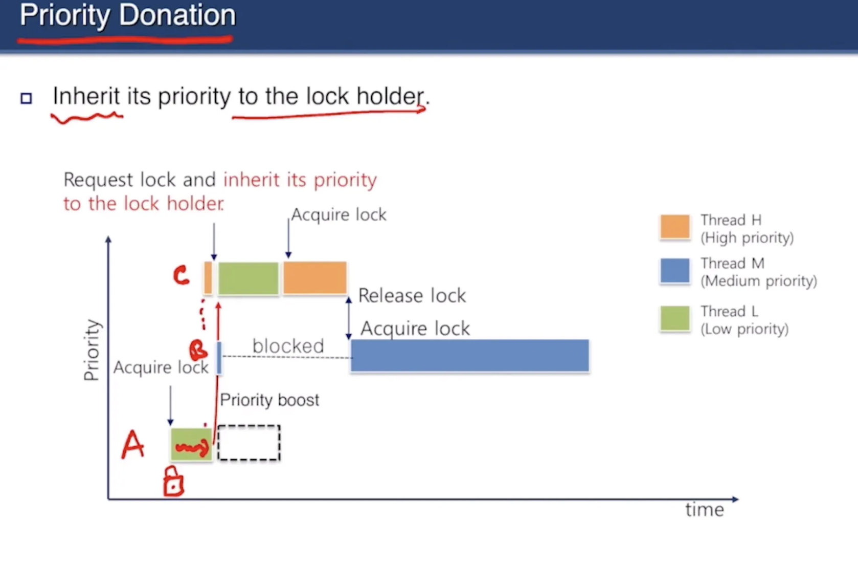 이를 해결하기 위해서는 priority donation을 구현해야 한다. 이 역시 개념은 단순하다. 락 소유자인 A에게 C의 우선순위를 기부하여 B의 preemption 시도를 막을 수 있게 하는 것이다.