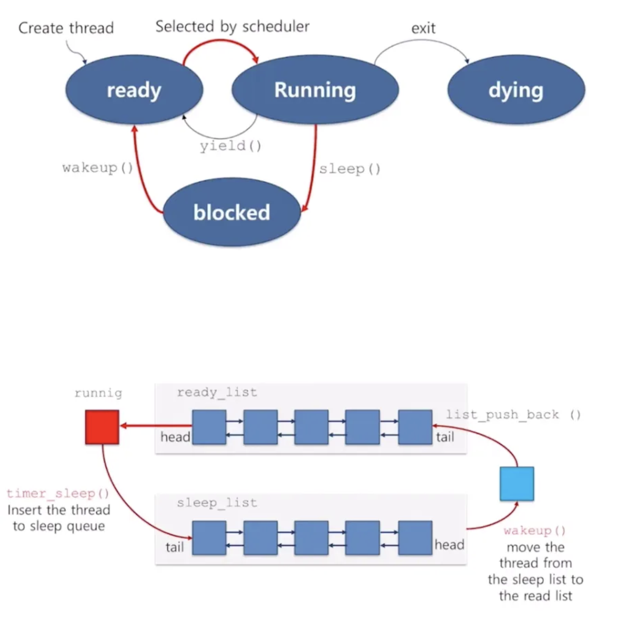 따라서 이를 개선하기 위해 아래와 같이 blocked 상태와 sleep list를 구현한다. sleep list에 blocked 쓰레드를 모두 대기시키고, 인터럽트를 줄 쓰레드만 interrupt handler가 검사하게 만들어 필요 없는 CPU 점유를 막는다.