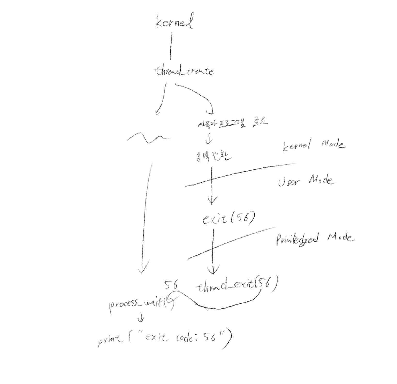 좌측의 흐름이 커널 메인, 우측의 흐름이 유저 프로그램을 실행한 자식 쓰레드입니다. 이때 exit의 인자값 전달 과정은 아래를 따릅니다.