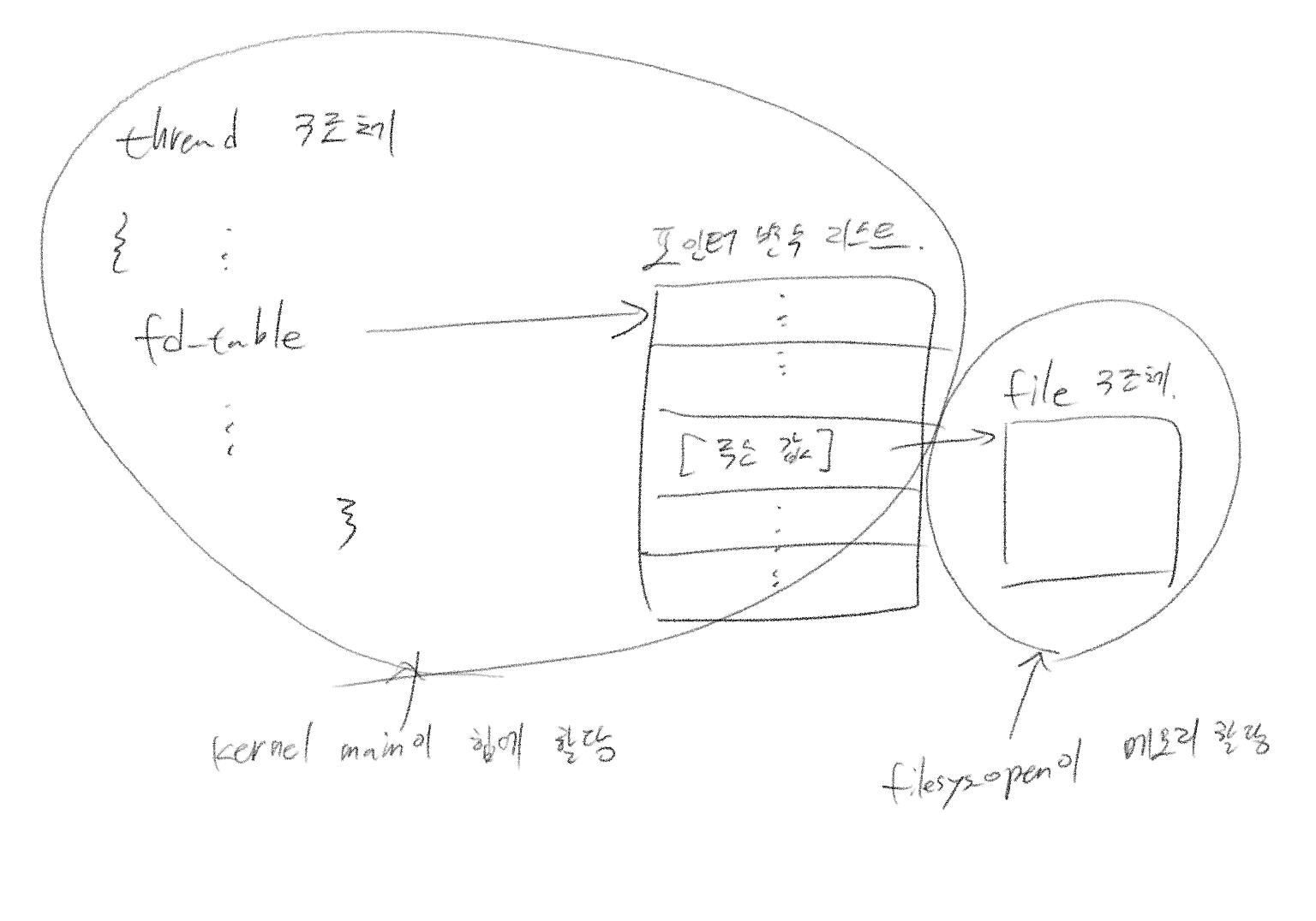 핀토스의 프로세스는 쓰레드 하나로 만들어지기 때문에 fd_table을 쓰레드 구조체에 추가해주는 것이 첫 번째 할 일이다. 여기에는 몇 가지 방법이 있는데 쓰레드 내에 fd_table을 직접 할당하는 것이 있고, 또는 fd_table에 대한 포인터 변수만 구조체에 넣고 실제 테이블을 따로 할당한 후 포인터에 참조시키는 방식이 있다.