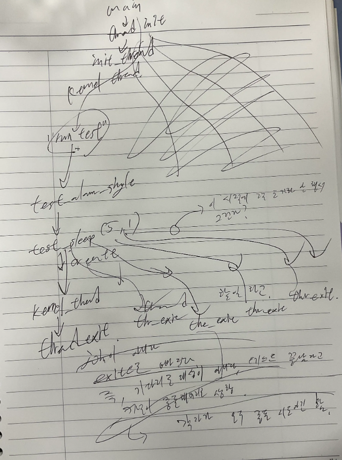 사사로운 트러블슈팅이었지만, fork와 같은 프로세스 복제 루틴을 구현하기 앞서 프로세스 생명 주기를 자세히 볼 수 있는 경험이었다. 아래는 그 당시 쓰레드 테스트 분기를 파악해보고자 작성한 그림.