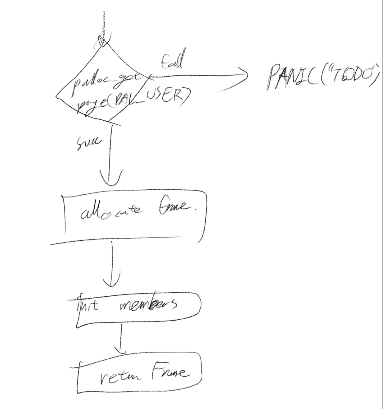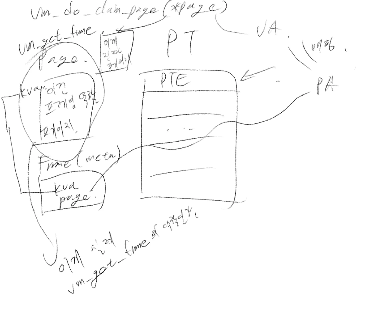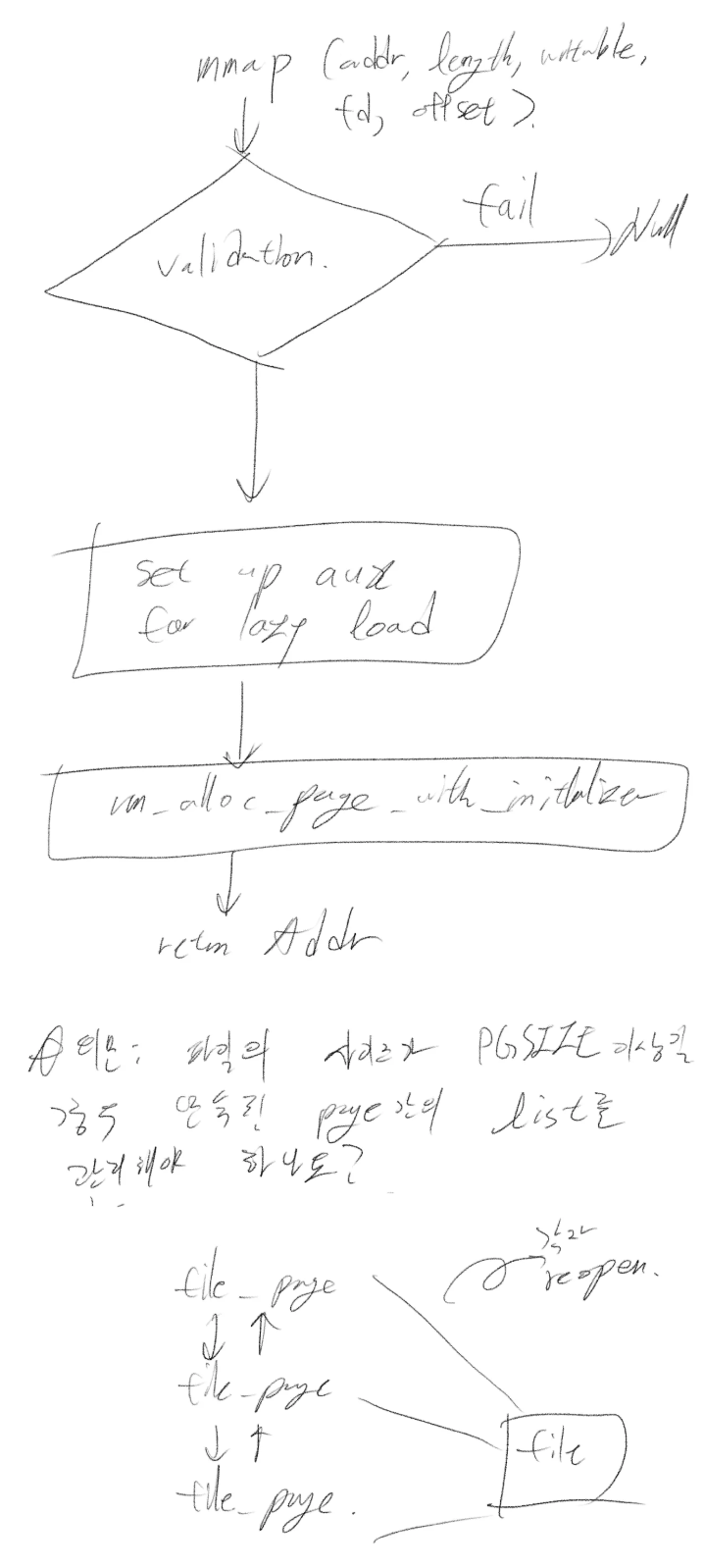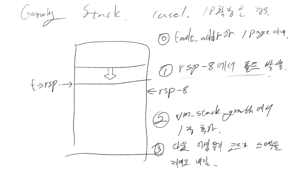 간략히 그려본 다이어그램은 위와 같습니다. palloc_get_page()를 통해 유저 풀에서 프레임 획득을 시도하는데, 실패할 경우 커널 패닉을 일으키도록 일단은 임시 조치를 해야 합니다.