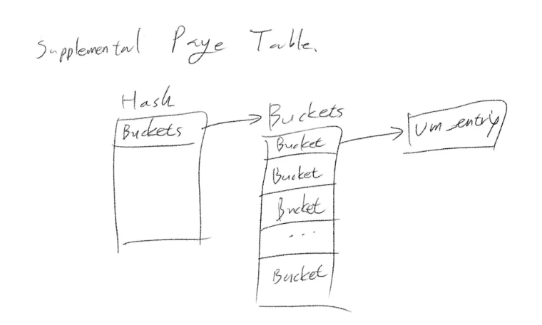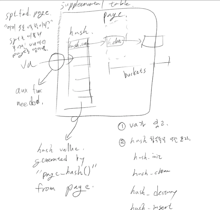 초기 구상은 이렇게 해쉬 테이블을 SPT의 멤버로 만들어 놓고, 해쉬 테이블의 버킷에 vm_entry(매핑 정보가 저장됨)를 저장하는 것이었습니다.