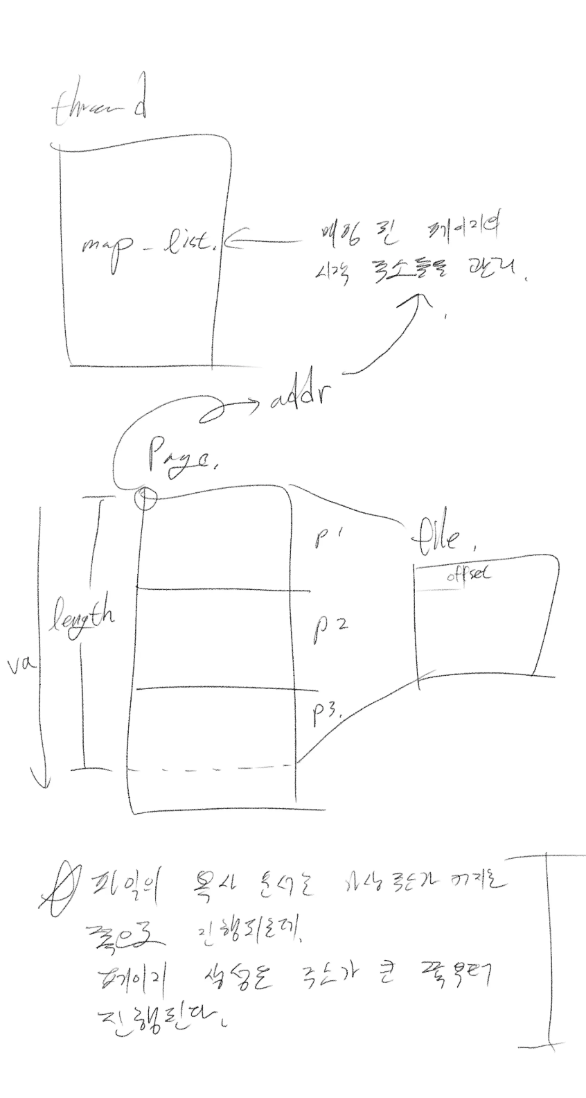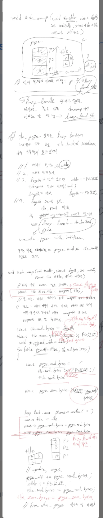 anon page의 스와핑은 아래와 같이 구현할 수 있습니다. 이때, kva의 역할은 무엇일까요? 정답은 ‘이미 결정된 메모리 주소’입니다. anon_swap_in은 직접적인 데이터 복사를 수행하는 루틴이므로 필요한 메모리 주소에 disk_read를 수행합니다. kva는 spt의 가상주소:물리주소 매핑을 통해 얻을 수 있겠죠?